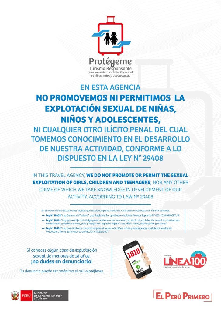 Conforme al cumplimiento del Decreto Supremo Nº 005-2020-MINCETUR que aprueba el Reglamento de Agencias de Viajes y Turismo, Wanderlus Machupicchu ha suscrito el Codigo de Conducta Contra la Explotación de Niños, Niñas y Adolescentes (ESNNA). De esta forma ratificamos nuestro código de étia organizacional y rechazamos, denunciamos y condenamos firmemente cualquier práctica relacionada al abuso sexual y la explotación de menores en el Perú y el mundo.